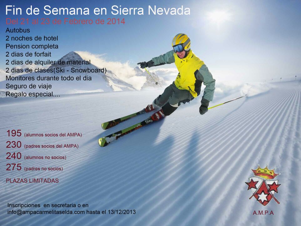 Este año el A.M.P.A organiza un estupendo viaje a la nieve, si quieres participar apúntate antes del 20-12-2013, manda un correo a info@ampacarmelitaselda.com.